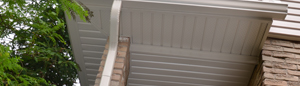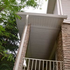 The soffit is the exposed undersurface of any exterior overhanging section of roof eaves. In addition to roof vents, your homes soffit plays a crucial role in the elimination of very hot stale air in summer and warmer humid air in winter from your attic space. Cooler air is drawn in through the soffit and exhausted out through the roof vents. We use vented soffit panels on all eaves and gables and non vented panels on porch ceilings. A wide variety of colours are available.