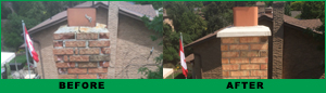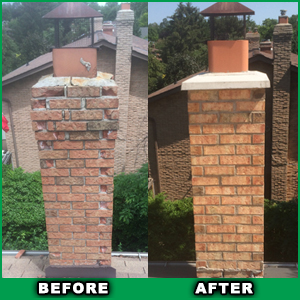 Usually caused by a crack or absence of a concrete chimney cap, water can migrate along the mortar joints of the brick below especially in the winter months during a thaw. When temperature goes below freezing there is expansion which causes the mortar to crack, as this worsens, water starts to migrate inside the brick and then the actual bricks will crack or spall. Damage caught early and installing a new concrete chimney cap will prevent further damage. Left as is the cracking and spalling starts to travel down the chimney to the roof line or even below.