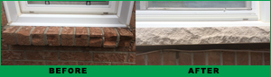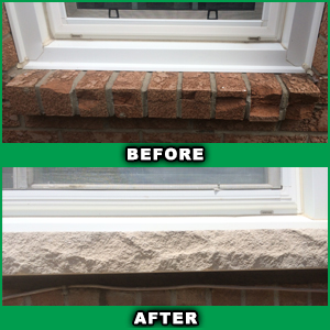 A lot of homes were constructed using bricks as window sills. When water migrates down through the mortar joints and freezes in the winter months, step cracks and eventually spalling occurs. Instead of fixing the brick sills, we recommend replacing the brick with new one piece limestone sills.