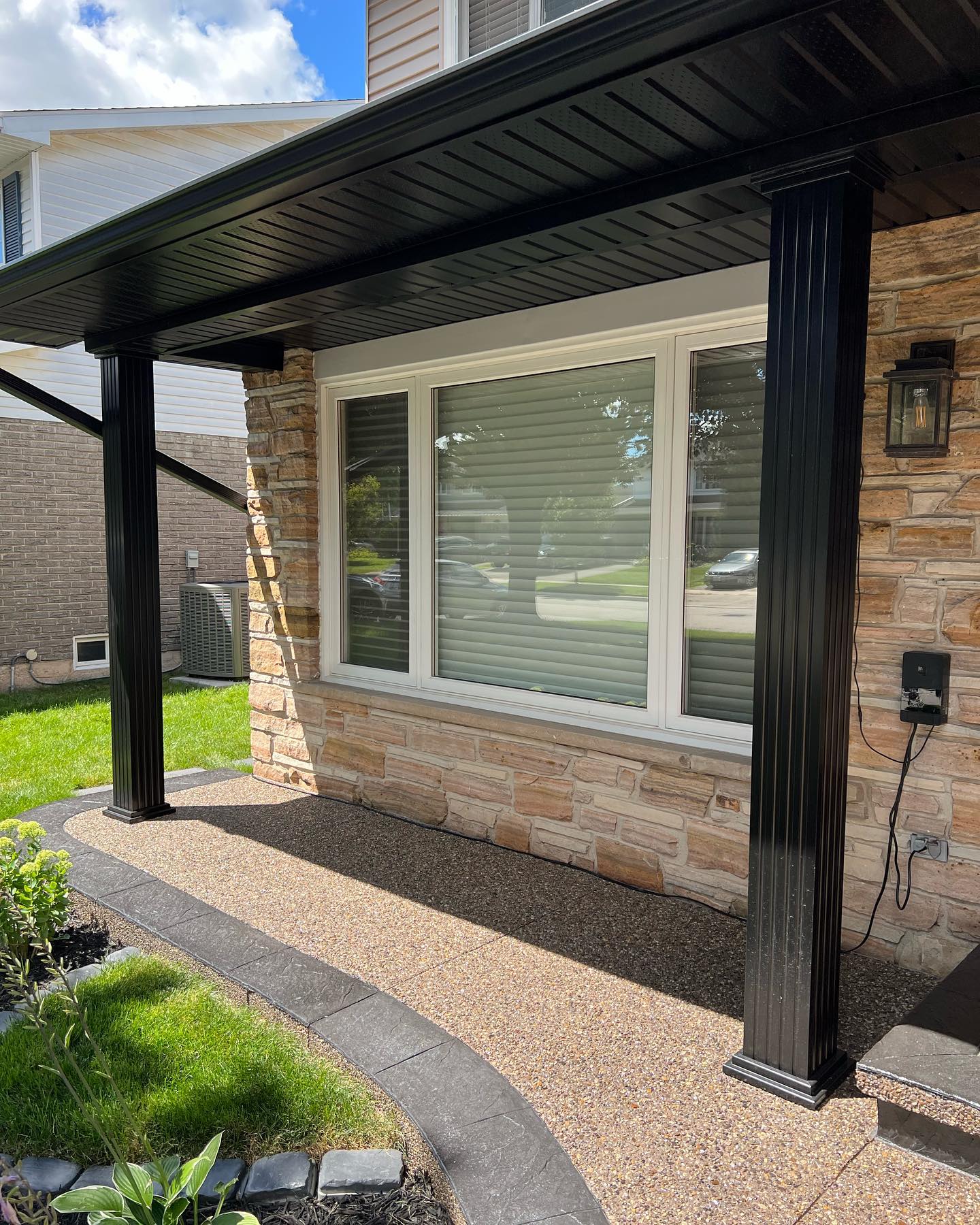 Outside of traditional aluminum soffit, we now offer new modern materials made from aluminum or steel with a wood grain look.